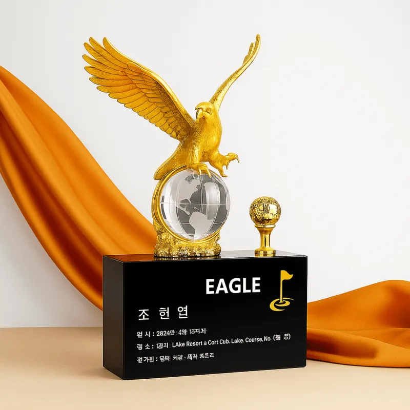 - Kim loại mạ vàng: tượng đại bàng và quả bóng golf được đúc từ hợp kim cao cấp, phủ lớp vàng sáng bóng, không bong tróc, không hoen gỉ – tạo điểm nhấn mạnh mẽ cho tổng thể.
