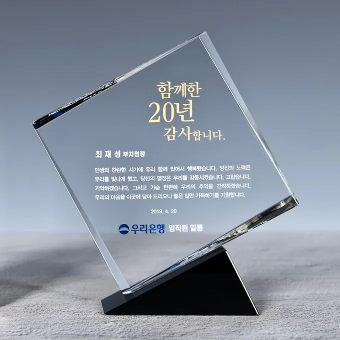 Mẫu Kỷ niệm chương trong suốt được làm từ pha lê K7 sắc sảo; tạo hình phong cách truyền thống với phần thân và đế dày dặn. Các đường nét góc cạnh cắt mài cẩn thận tạo phong cách mạnh mẽ.